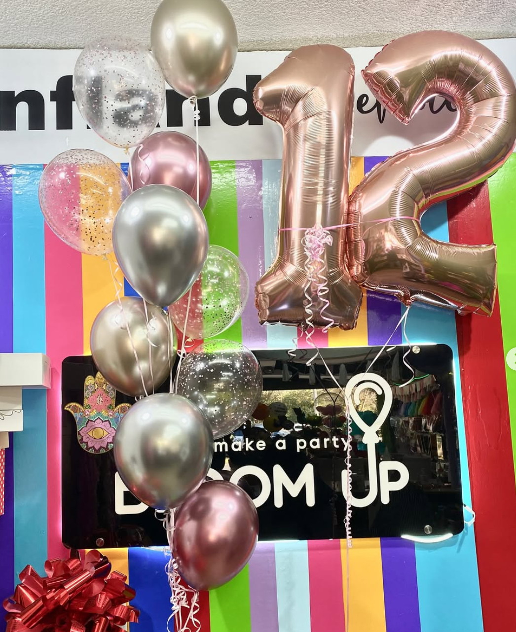 Este arreglo incluye: -2 Números 12# en 34" con helio, 4 Globos Transparentes 11" con helio, 6 Globos Látex 11" con helio, con tassel, atado a un contrapeso. **La visualización final del producto entregado puede variar en respecto a esta imagen, ya que el arreglo de globos se elabora a mano.**