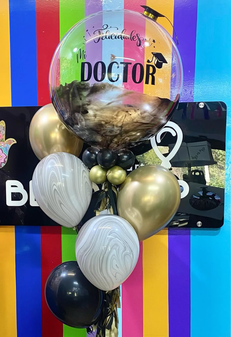 Este arreglo incluye: - 1 globo JUMBO 36" transparente con pinturas multicolor, inflado con helio, con tassel, atado a un contrapeso y cinco globos látex con helio. Incluye la frase escrita y decoraciones temáticas personalizables. **La visualización final del producto entregado puede variar en respecto a esta imagen, ya que el arreglo de globos se elabora a mano.**