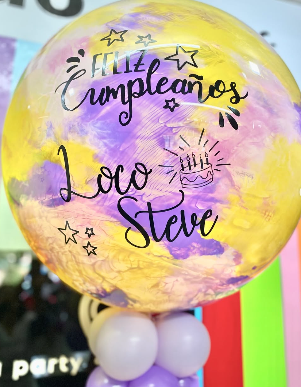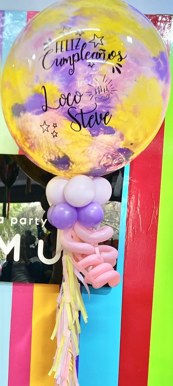 Este arreglo incluye: - 1 globo JUMBO 36" transparente con pinturas multicolor, inflado con helio, con tassel, atado a un contrapeso. Incluye la frase escrita y decoraciones temáticas personalizables. **La visualización final del producto entregado puede variar en respecto a esta imagen, ya que el arreglo de globos se elabora a mano.**