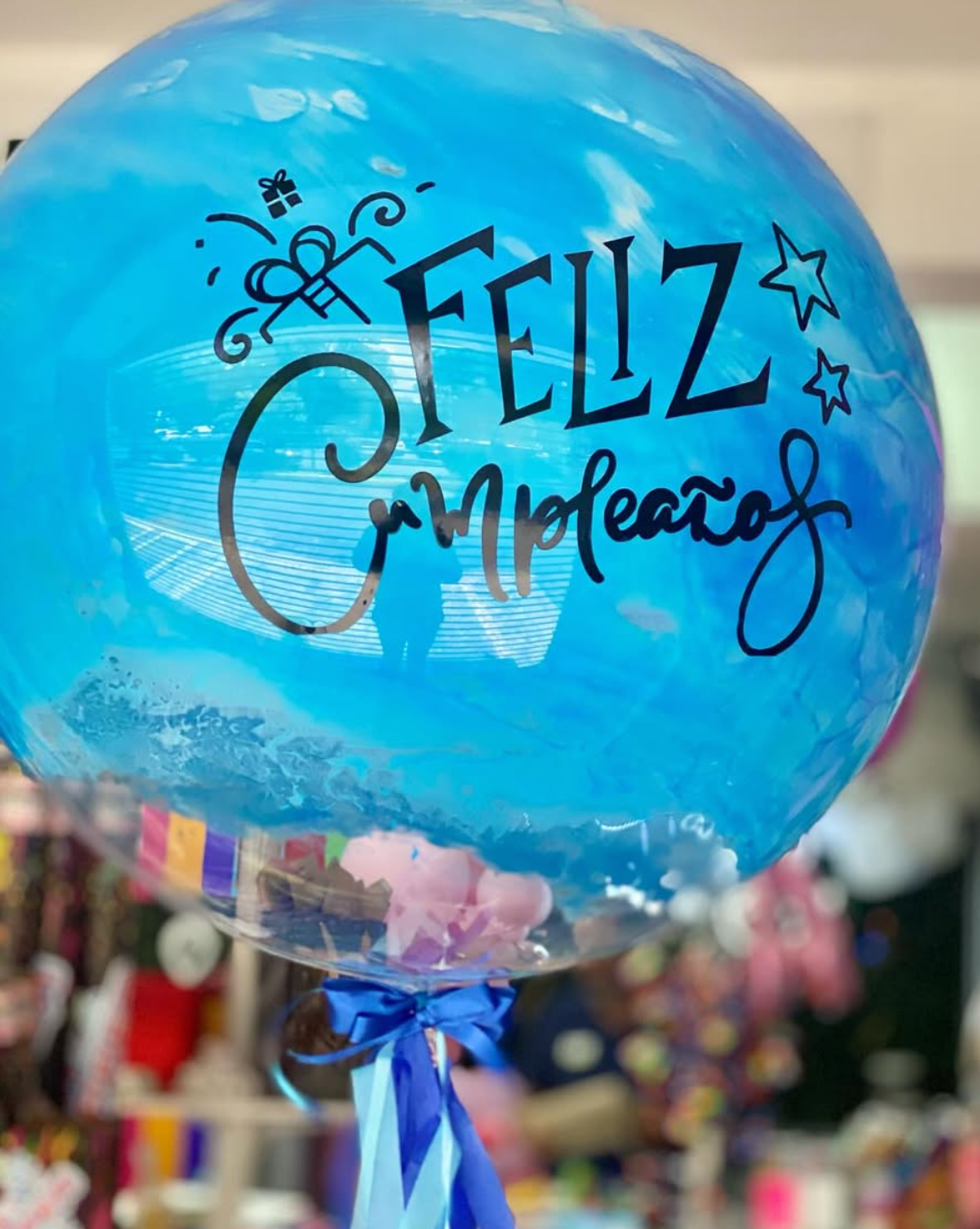 Este arreglo incluye: - 1 globo GIGANTE 24" transparente con pinturas multicolor, inflado con helio, con tassel, atado a un contrapeso. Incluye la frase escrita y decoraciones temáticas personalizables. **La visualización final del producto entregado puede variar en respecto a esta imagen, ya que el arreglo de globos se elabora a mano.**