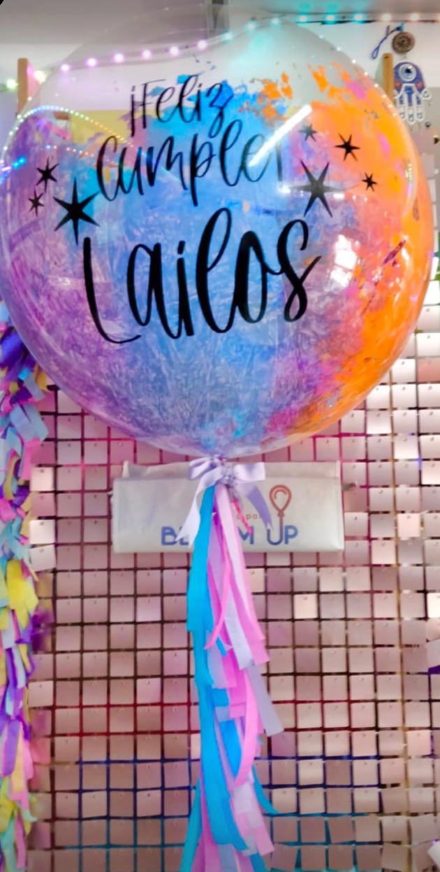 Este arreglo incluye: - 1 globo GIGANTE 24" transparente con pinturas multicolor, inflado con helio, con tassel, atado a un contrapeso. Incluye la frase escrita y decoraciones temáticas personalizables. **La visualización final del producto entregado puede variar en respecto a esta imagen, ya que el arreglo de globos se elabora a mano.**