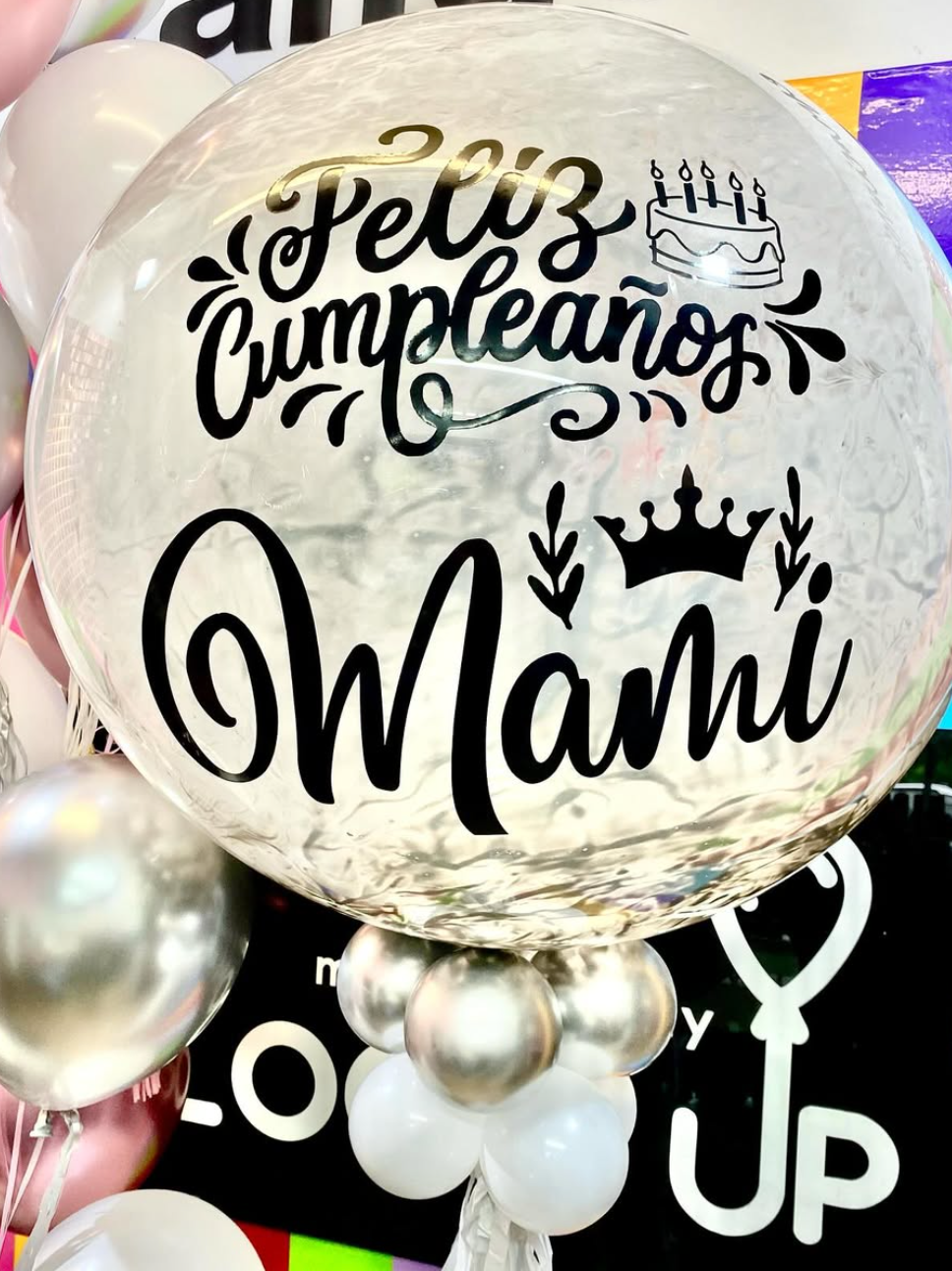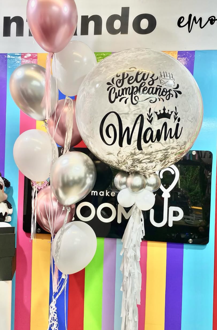 Este arreglo incluye: - 1 globo JUMBO 36" transparente con pintura multicolor, inflado con helio, con tassel, atado a un contrapeso y ocho globos látex con helio. Incluye la frase escrita y decoraciones temáticas personalizables. **La visualización final del producto entregado puede variar en respecto a esta imagen, ya que el arreglo de globos se elabora a mano.**