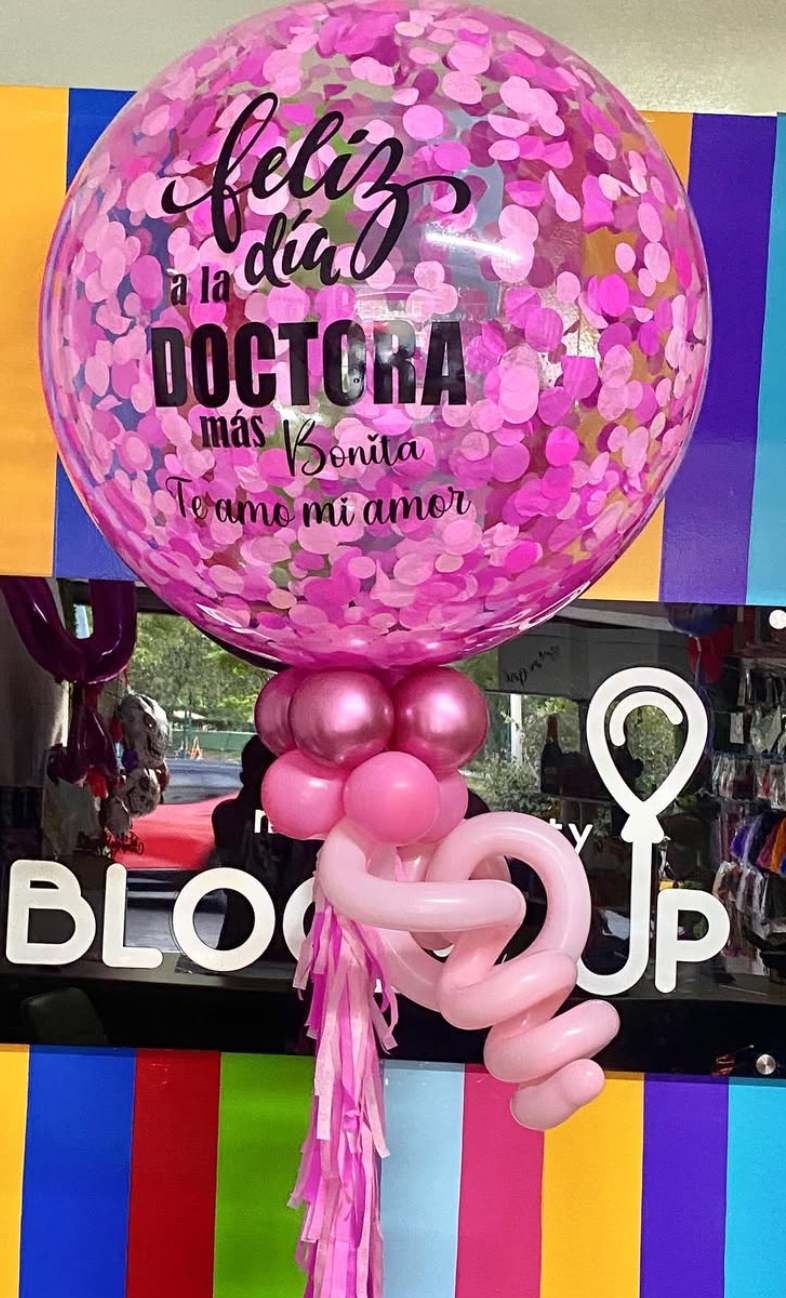 Este arreglo incluye: - 1 globo JUMBO 36" transparente con papelitos multicolor, inflado con helio, con tassel, atado a un contrapeso. Incluye la frase escrita y decoraciones temáticas personalizables. **La visualización final del producto entregado puede variar en respecto a esta imagen, ya que el arreglo de globos se elabora a mano.**