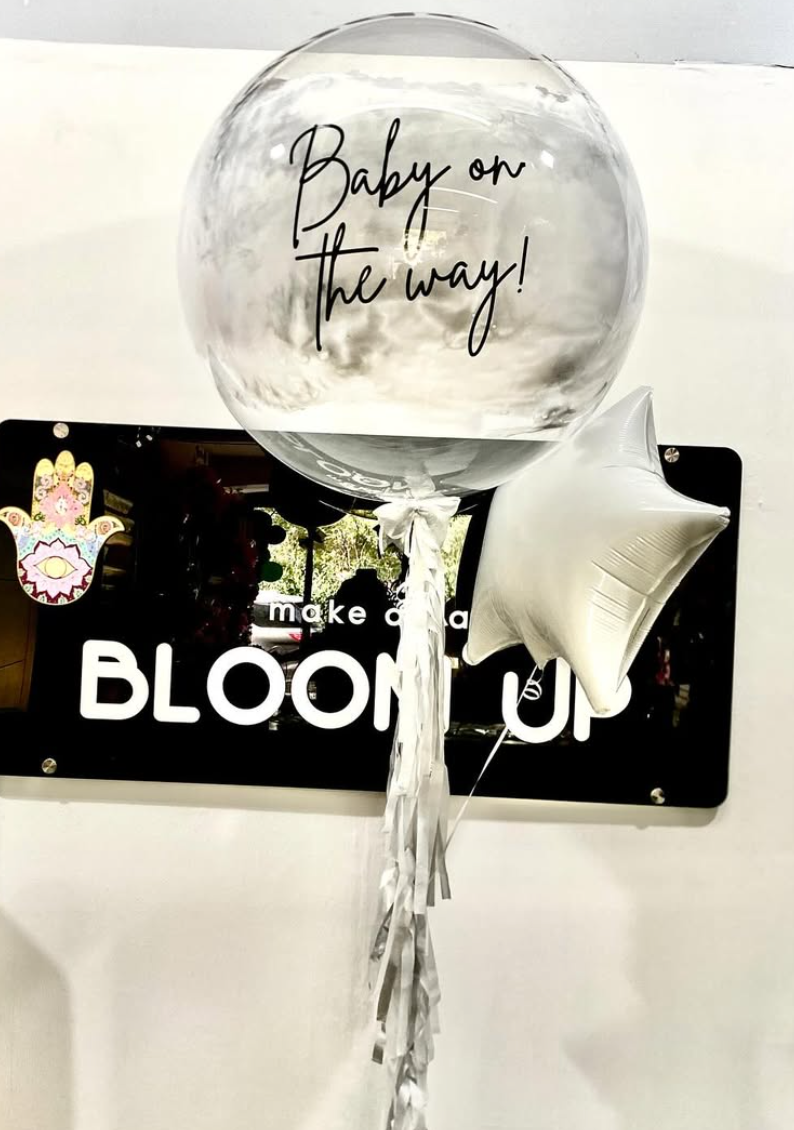 Este arreglo incluye: - 1 globo GIGANTE 24" transparente con pinturas multicolor, inflado con helio, con tassel, atado a un contrapeso y una Estrella Metálica con helio. Incluye la frase escrita y decoraciones temáticas personalizables. **La visualización final del producto entregado puede variar en respecto a esta imagen, ya que el arreglo de globos se elabora a mano.**