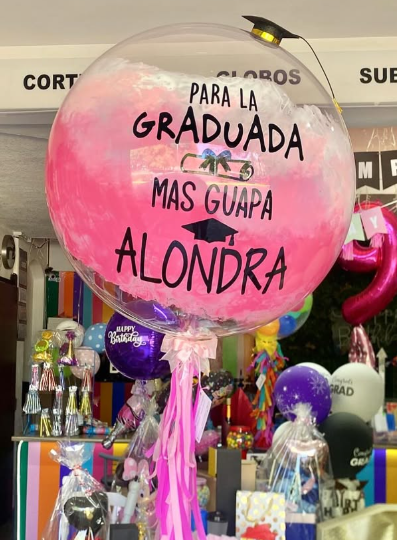 Este arreglo incluye: - 1 globo GIGANTE 24" transparente con pinturas multicolor, inflado con helio, con tassel, atado a un contrapeso. Incluye la frase escrita y decoraciones temáticas personalizables. **La visualización final del producto entregado puede variar en respecto a esta imagen, ya que el arreglo de globos se elabora a mano.**
