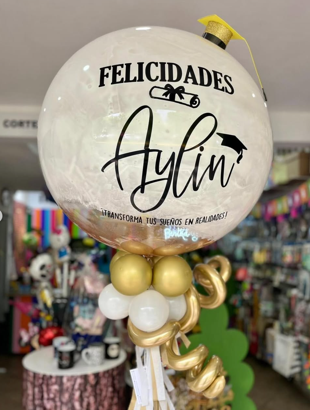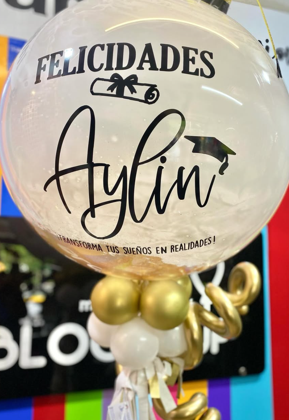 Este arreglo incluye: - 1 globo JUMBO 36" transparente con pinturas multicolor, inflado con helio, con tassel, atado a un contrapeso. Incluye la frase escrita y decoraciones temáticas personalizables. **La visualización final del producto entregado puede variar en respecto a esta imagen, ya que el arreglo de globos se elabora a mano.**