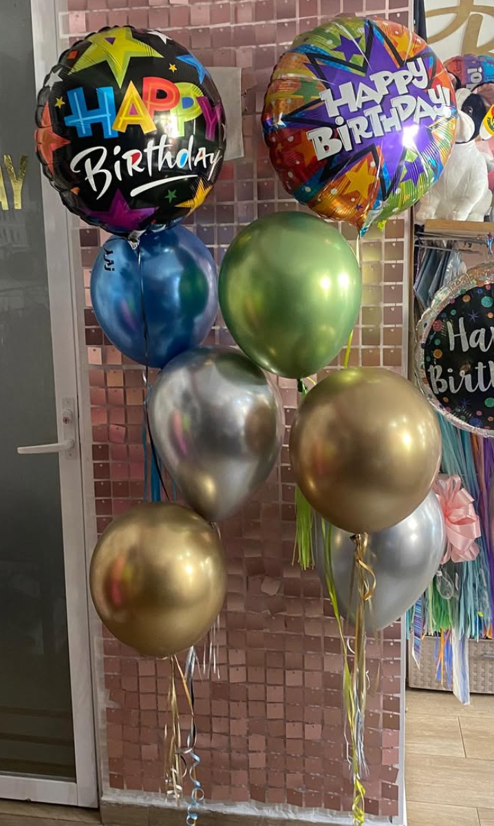 Este arreglo incluye: 2 bouquets de globos metálicos y de latex inflados con helio, con tassel, atado a un contrapeso.**La visualización final del producto entregado puede variar en respecto a esta imagen, ya que el arreglo de globos se elabora a mano.**